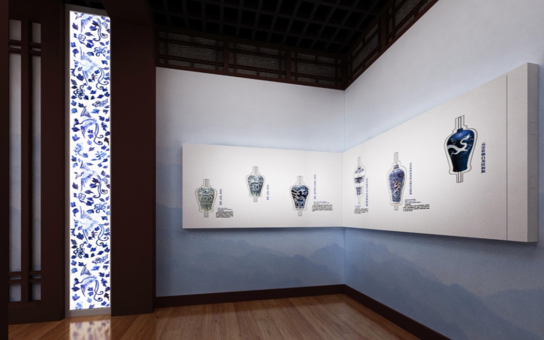 元青花是我国古代青花瓷中精品,存世元青花更是凤毛麟角,武汉博物馆馆藏的元青花“四爱图”梅瓶更是其中仅存的珍品之一。我们充分挖掘馆藏“元青花‘四爱图’梅瓶”的特征与其纹饰的故事营造环境氛围,突出“元青花‘四爱图’梅瓶”这一文物,并通过光影变幻、多媒体互动等让整体展陈空间主次分明、生动丰富。